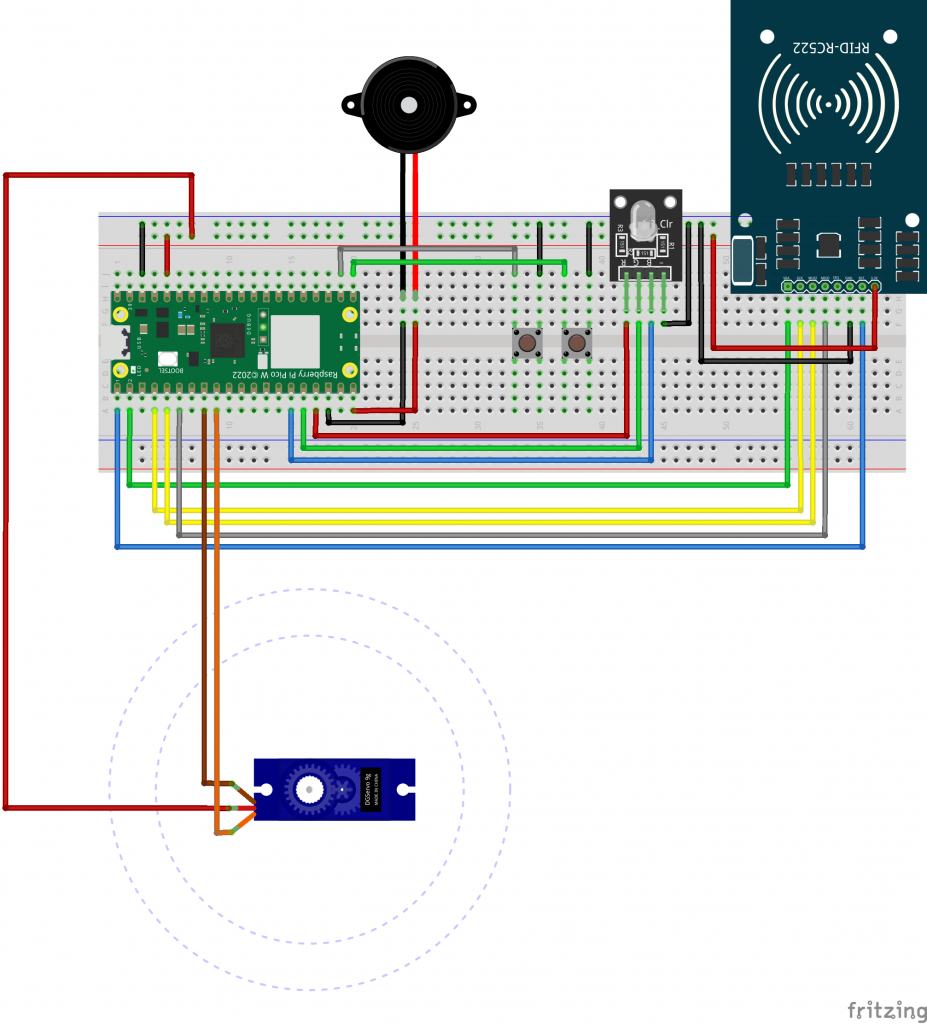 Als je een flink arsenaal aan componenten hebt is er altijd wel wat dat je kunt gebruiken. Zo begonnen we met de basis: een experimenteerboard. Daarop een (oudere) Raspberry Pico waarop een bekende cardreader op aangesloten werd. Even op internet kijken hoe dat ook alweer ging, de bijbehorende (Python) bibliotheken downloaden en instaleren en binnen de kortste tijd was het al mogelijk om diverse tags in verschillende uitvoeringen te lezen. Dat wil zeggen: voor de taglezer houden en de code werd in het terminalscherm weer gegeven. So far so good.